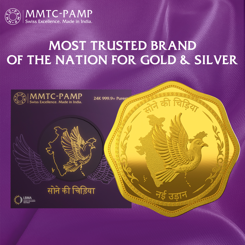 24K (999.9+) Purest 10 gm Sone Ki Chidiya Gold Coin – MMTC-PAMP. Certified 999.9+ pure gold from MMTC-PAMP, India’s most trusted precious metals refinery. LBMA accredited. Individually serial numbered and securely sealed.