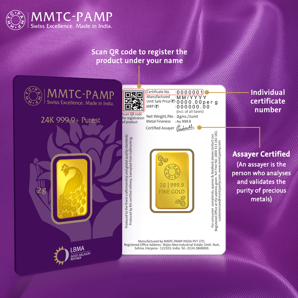 24K (999.9+) Purest 2 gm Peacock Gold Bar – MMTC-PAMP