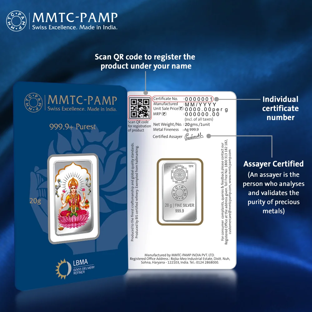 999.9+ Purest 20 gm Laxmi Colored Silver Bar – MMTC-PAMP